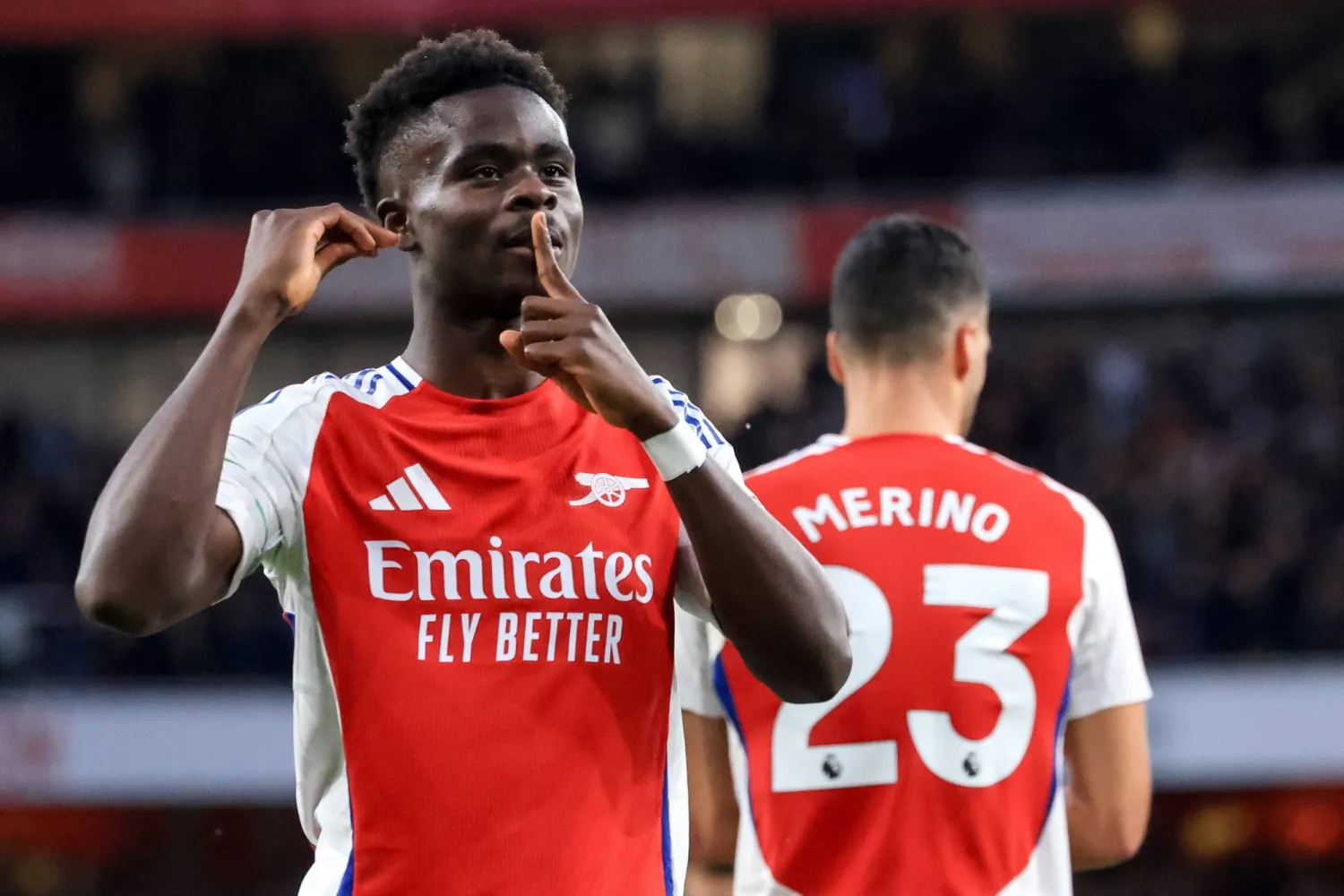 لاعبو أرسنال يحتفلون بهدف بوكايو ساكا الذي حسم الفوز على أولمبياكوس.  مصدر الصورة: Pinterest