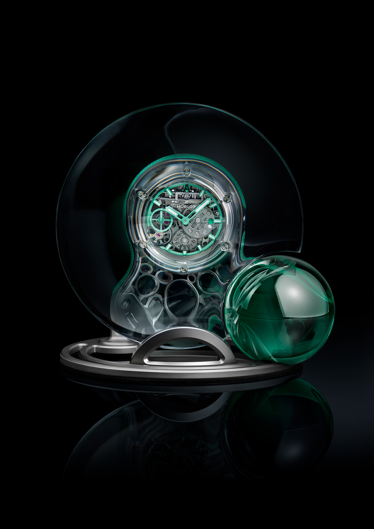 وتتميّز هذه الساعة ببنية التناوب الشطيرية، كما أنّها مزوّدة بكريستالَين مقبّبين على شكل قطرة ماء، مصنوعين بمنتهى البراعة والروعة. وتُحاكي علبة التيتانيوم المخرّمة الدانتيل الرقيق المنسوج على شكل قطرة. أمّا المصدّات الجانبية فهي من المطّاط بلون Arsham Green الأخضر الخاص، وقد طُبع عليها شعار الفنّان.