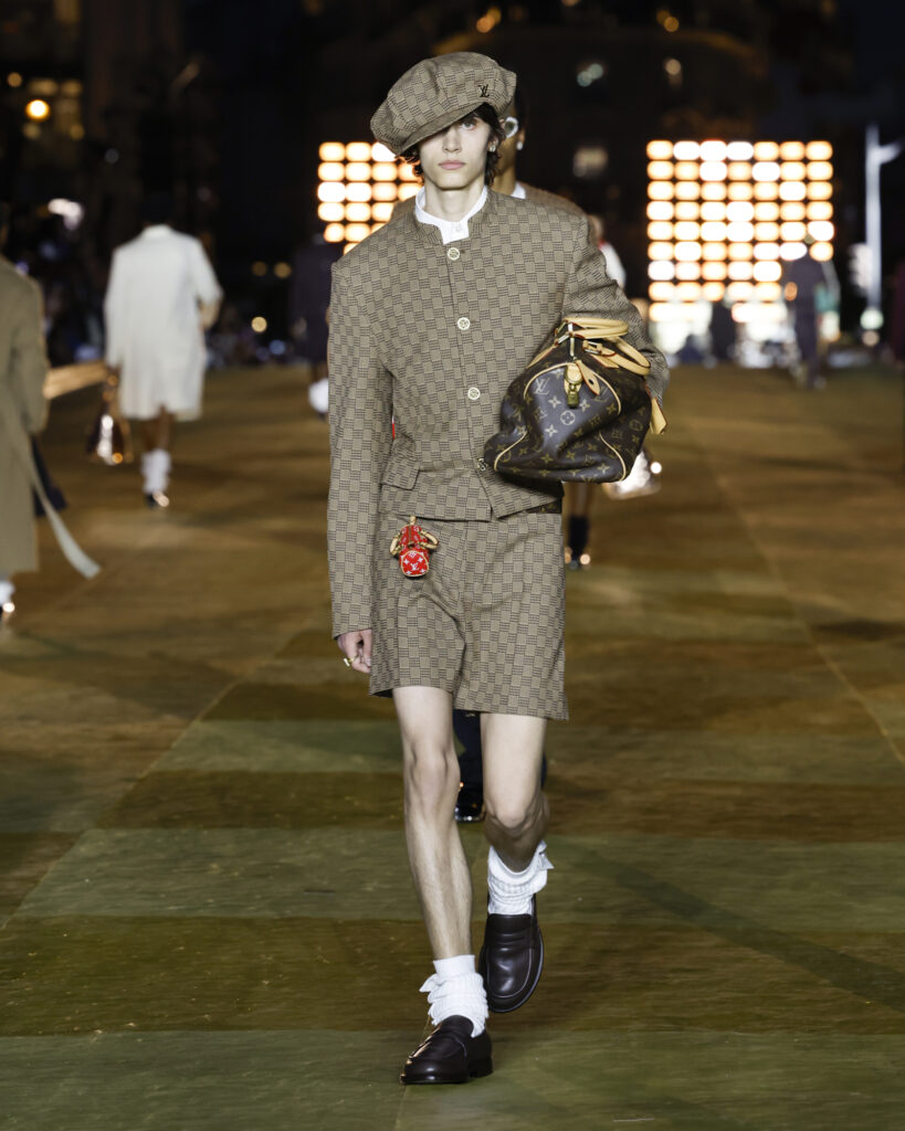 بعد رحيل فيرجيل أبلوه، الذي لطالما عُرف عنه جمعه بمهارة بين الطابع الفاخر وأزياء الشارع، تولّى النجم المتعدّد المواهب فاريل ويليامز مهام الإدارة الإبداعية للملابس الرجالية لدى لويس ڤويتون، ومن أبرز التصاميم التي تضمّنتها مجموعته، تلك المقتبسة من بزات عسكرية أم ملابس تمويه، واللافت في المجموعة الأحذية الكبيرة والبدلات الأكثر التصاقاً بالجسم مما كانت عليه، أما نقشة المربعات الشهيرة لدى لويس ڤويتون فهي حاضرة على كل التصاميم، وخصوصاً الحقائب. تضمّن العرض حوالي 75 إطلالة رجاليّة تخلّلتها بعض التصاميم الأنثويّة، وقد اعتمد المصمّم على طبعة التمويه العسكريّة التي نفّذها بواسطة المربعات الأيقونيّة للدار. اعتمد فاريل في بعض التصاميم على تدرجات الأخضر بالإضافة إلى الأبيض والأسود والرمادي وفي تصاميم أخرى تظهر خامة الدنيم وتدخل ألوان مختلفة يتزيّن معظمها بالمربعات كما يظهر «مونوغرام» LV مطرزاً على التصاميم. وأتت الحقائب بأحجام متنوّعة من الصغيرة جداً حتى حقائب السفر. وتألّقت طبعة المربعات بكثافة أيضاً على الحقائب ودخلت عليها ألوان قويّة نادراً ما تستعمل في الحقائب الرجاليّة مثل، الأحمر والأزرق والأخضر والبرتقالي والأصفر. وأتت الأحذية بإستيحاء من الطابع الرياضي أم العسكري. إنها مجموعة مميّزة فعلاً تضمن أساليب تضج بالفرادة واللمسات الجريئة.