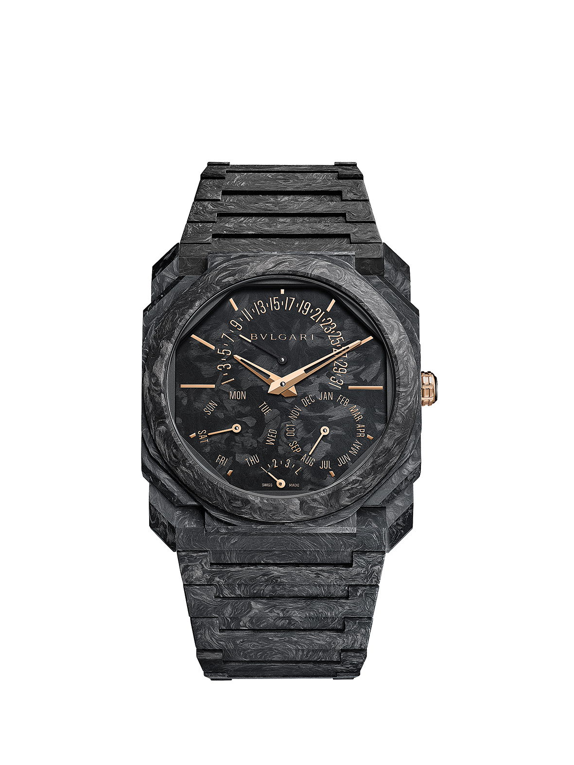 يبرز من بين الإبتكارات الجديدة، نموذجان من مجموعة أوكتو فـينيسيمو يتألّقان بمواد يتم استعمالها لأول مرة، فبعد أن حقّقت العلامة نجاحًا مذهلاً مع الساعات المصنوعة من التيتانيوم والبلاتين والذهب الوردي والخزف والتانتالوم، تكشف الخيارات الجديدة عن توليفة إستثنائية بتدرجات الكربون والذهبي، حيث يتلاقى اللون الأسود الفاحم المعالج بتكنولوجيا متطوّرة مع إشراقة الذهب، فـي خطوة تكتمل معها حكاية أوكتو فـينيسيمو التي حصدت ثمانية أرقام قياسية عالمية منذ عام 2014، وواصلت مسيرة التميّز مع نموذجين يعملان بتقنية أوتوماتيكية محقّقين رقماً قياسياً عام 2017، إضافة إلى ساعة أوكتو فـينيسيمو بيربيتشول كالندر التي سجّلت رقماً قياسياً عام 2021.