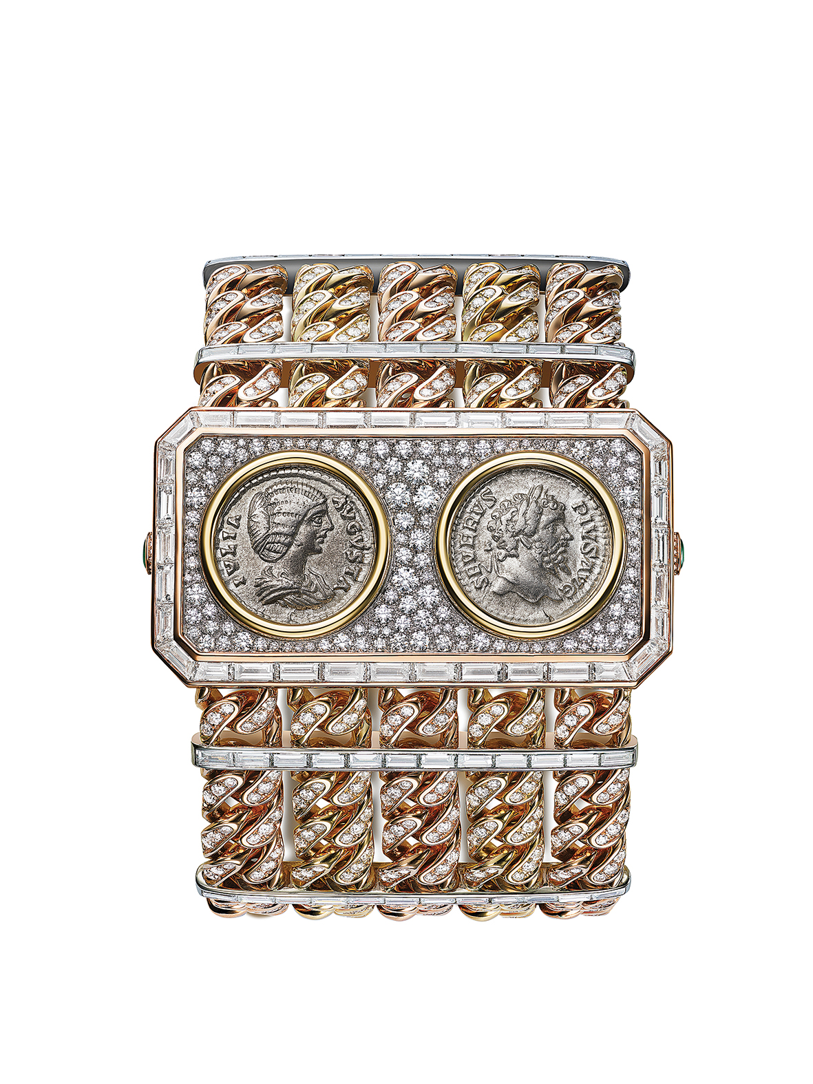 هيكل من الذهب الوردي الأصفر والأبيض، تزيّنه ترصيعات من الألماس المقصوص وفق القطع المتطاول (وزن 21,76 قيراط تقريباً) مع ألماس بالقطع متعدّد الأوجه (وزن 20,80 تقريباً)- غطاء خارجي مزيّن بعملتين نقديتين تحمل إحداهما نقشاً للإمبراطور سيبتيموس سيفـيروس (193-211 م) بينما تصوّر الاخرى زوجته جوليا دومنا (193-217م) – حجرين من الزمرد وفق قطع الكابوشون يعملان بتقنية الضغط لفتح الغطاء الخارجي وعرض الميناء. ثنائية من حركية بيكوليسيمو الميكانيكية فائقة الصغر ويدوية التعبئة من طراز بولغري 100 – سماكة 2,5 ملم – احتياطي طاقة لمدة 30 ساعة – 21,600 اهتزازاً بالساعة (3 هرتز).