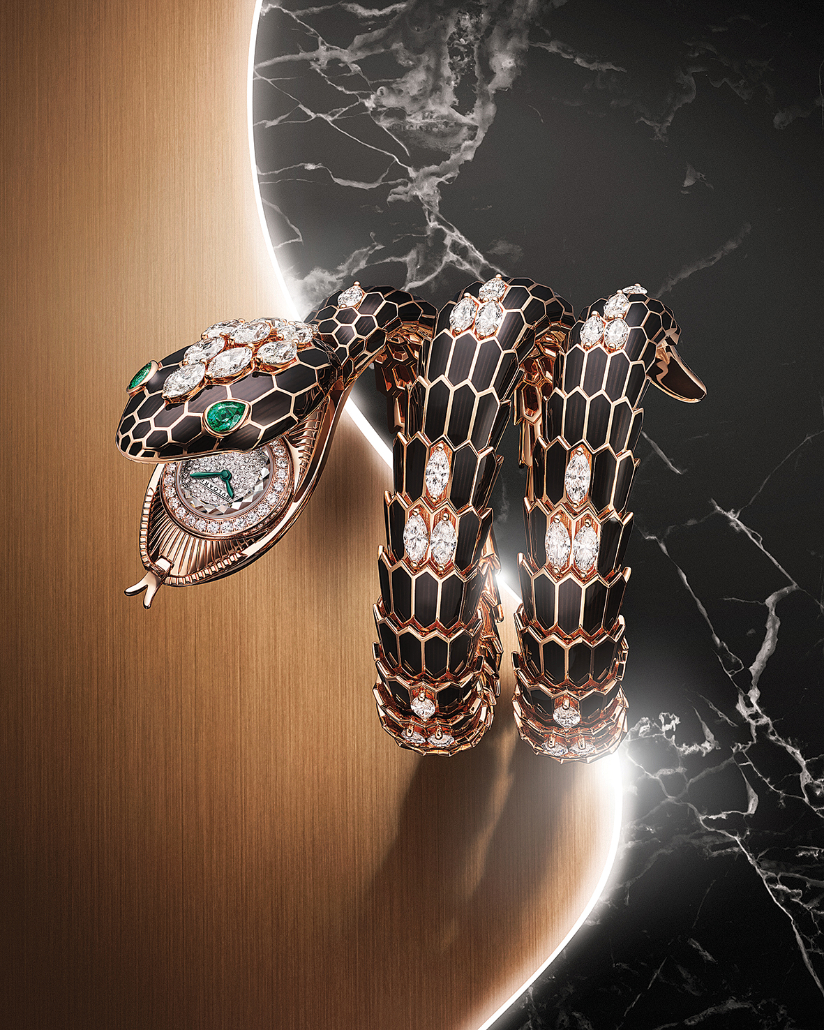 هيكل مشرق بالذهب الوردي مع تفاصيل ملوّنة بالأسود اللامع، وترصيعات ألماس وفق القطع المتطاول كالقارب (وزن 11,9 قيراط)، حجريّ زمرد يمثّلان عينيّ الأفعى وفق قطع الكمثرى (وزن 0,44 قيراط) – ميناء مخفـي مرصّع بالألماس (وزن 0,28 قيراط) – حركية ميكانيكية يدوية التعبئة وفائقة النحافة نوع بيكوليسيمو من إبداع العلامة، بسماكة 2,5 ملم، مع احتياطي طاقة يكفـي لمدة 30 ساعة وتردد (3 هرتز) 21,600 اهتزاز فـي الساعة – تاج تعبئة مثبّت أسفل الساعة – حركية قابلة للتبديل، إذ يمكن شراء آلية حركة تعمل بتقنية الكوارتز بشكل منفصل.