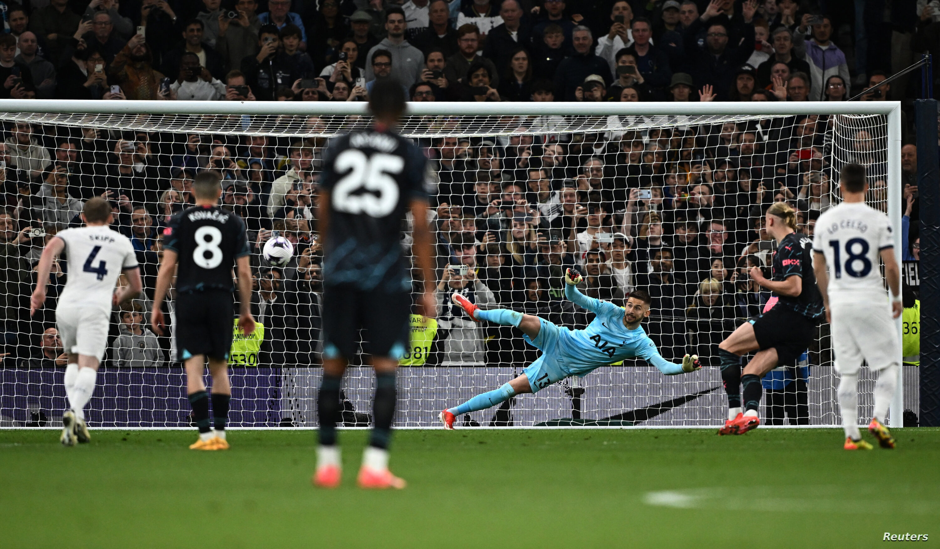 ساهم إرلينج هالاند، في وضع مانشستر سيتي على مسافة قريبة من لقب الدوري الإنجليزي الممتاز لكرة القدم للمرة الرابعة على التوالي في إنجاز لا سابق له، حيث سجل ثنائية، محققاً الفوز على مضيفه توتنهام هوتسبير 2-صفر. وسجل المهاجم النرويجي الهدف الأول لفريقه في بداية الشوط الثاني وهدأ أعصاب جماهير سيتي في الوقت المحتسب بدل الضائع عندما سجل الهدف الثاني له ولفريقه من ركلة جزاء محرزاً هدفه 27 في الدوري هذا الموسم. وكاد أن تتلقى شباكه هدف التعادل عبر سون هيونج-مين في وقت متأخر، قبل أن يتأكد هالاند من أن فريقه ابقى مصيره بين يديه قبل نهاية المباراة. ودخل السيتي إلى المباراة مدركاً أن الفوز بهذه المباراة سيكون مفتاح إحراز اللقب بعدما كان متأخرًا عن آرسنال المتصدر السابق بفارق نقطة واحدة. سيتي أنهى مرحلة النحس وفشل سيتي في الحصول على أي نقطة أو تسجيل أي هدف في أول أربع زيارات له في الدوري لملعب توتنهام الجديد لكنه أنهى هذا النحس في الوقت المناسب لإسعاد جماهيره. ويملك سيتي بقيادة بيب جوارديولا 88 نقطة مقابل 86 لأرسنال وسيضمن كتابة التاريخ إذا فاز على أرضه أمام وست هام يونايتد يوم الأحد 18 مايو، عندما يستضيف أرسنال منافسه إيفرتون، ما سيجعلهم أبطالًا للموسم الرابع على التوالي، بغض النظر عن نتيجة أرسنال ضد إيفرتون. ولم يتمكن أي فريق في تاريخ الدوري الإنجليزي الممتاز من الفوز بأربعة ألقاب متتالية. وتضمن هزيمة توتنهام أيضًا إنهاء أستون فيلا في المركز الرابع في دوري أبطال أوروبا، لينضم إلى سيتي وأرسنال وليفربول في المسابقة الأوروبية الأولى الموسم المقبل. تألق هالاند بعد أن غاب عن التهديف تعد هذه المرة الأولى التي يزور فيها هالاند الشباك بالبريميرليغ منذ 25 نوفمبر الماضي. وغاب هالاند عن التهديف طوال الفترة الماضية بسبب الإصابة، فضلا عن عدم الجاهزية. وبات هالاند أسرع لاعب في تاريخ البريميرليغ يسجل 50 هدفاً أو أكثر (51)، وذلك خلال 50 مواجهة يخوضها كأساسي بالبريميرليغ. ورفع هالاند رصيده في صدارة الهدافين إلى 27 هدفاً في 30 مباراة.