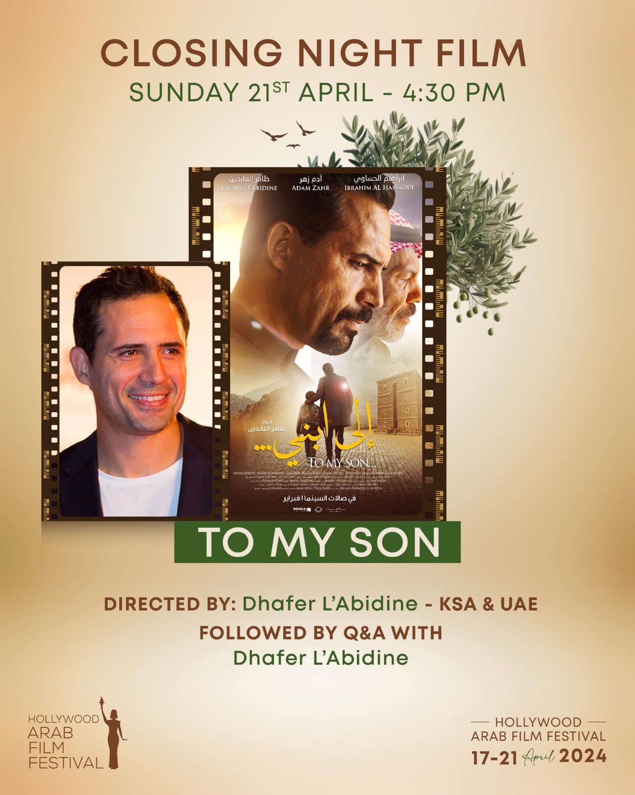 فيما لفت إلى أنه يمكن للجمهور الالتقاء بالفنان التونسي عقب عرض فيلمه “إلى ابني” الذي يعرض خلال الليلة الختامية للدورة الثالثة، حيث سيتم عرض الفيلم يوم الأحد الموافق 21 نيسان/أبريل في تمام الساعة الـ 4:30 عصراً.