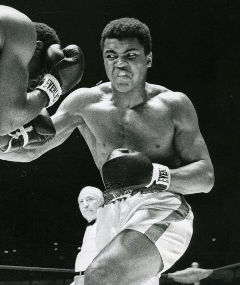– ضد الملاكم القوي جورج فورمان في زئير في العام 1974، وكان الفوز حليف كلاي.